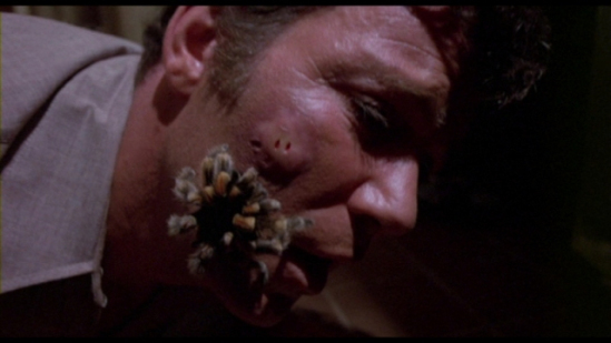 With that being said, there are many instances where little care was taken to assure that they didn’t fall and hurt themselves. There are three immediate examples that come to mind. First are when the spiders are coming through the air conditioning vent. This vent is on the ceiling and they fall into the sink below. That fall is certain death (not to mention boiling water is then poured all over them in the sink). In another scene tarantulas are shown dropping down the chimney. As they scurry away broken legs are clearly seen. Finally, there is also a scene where William Shatner rescues the little girl on the bed that is covered in tarantulas. After she jumps to safety he flips the comforter throwing the tarantulas at the camera. Sure it’s a great image but again, how many spiders were hurt, or worse, when they hit the floor?