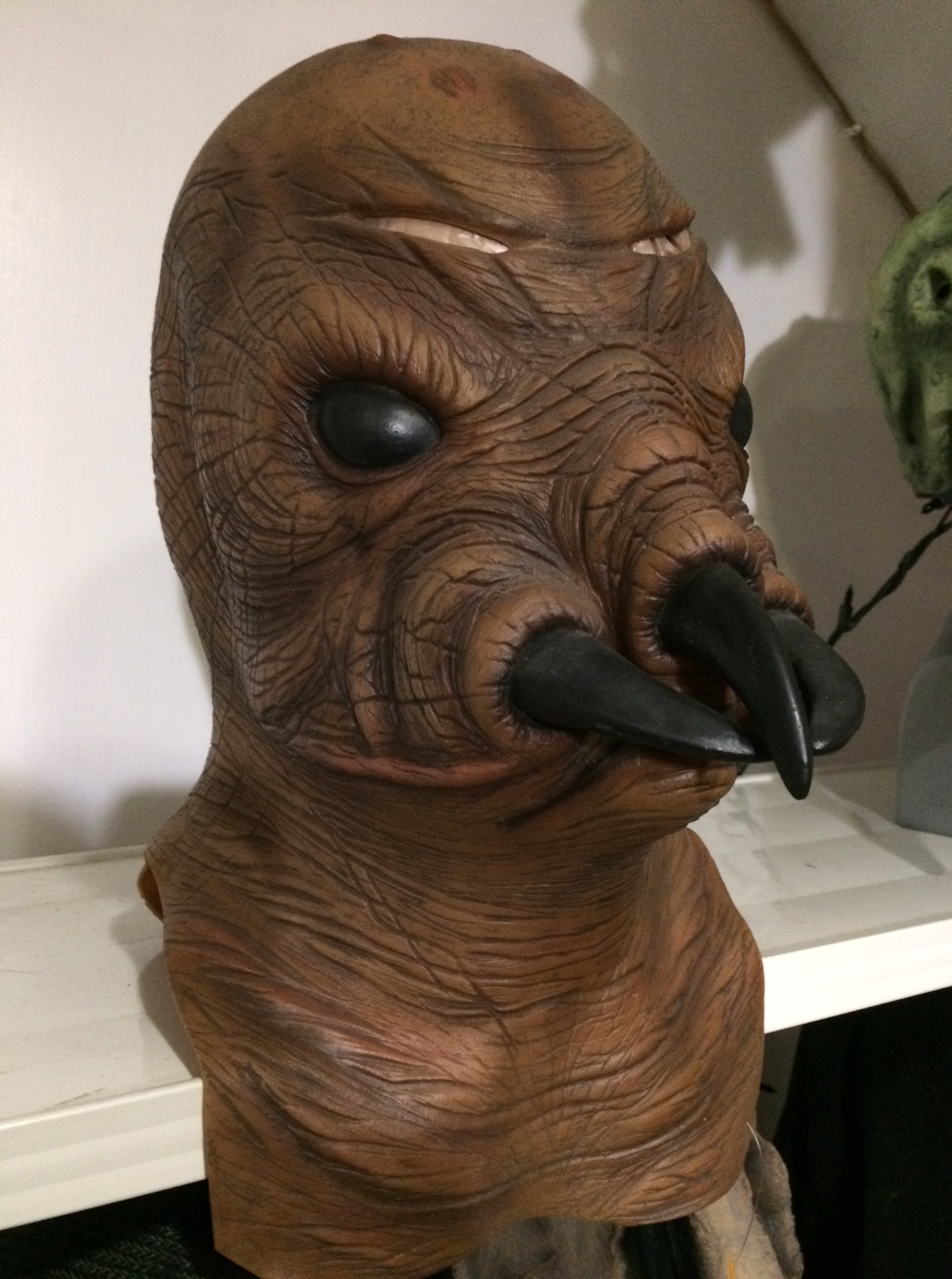 So let’s talk about the mask itself. The sculpture is very detailed, having an organic quality to it with lots of skin texture. The eyes are small and beady, giving it a nice creepy look (you see through slits in the forehead the blend in with the wrinkles). Where the mouth is, there are three appendages in a triangle that are claw like, that are surrounding a small slit of a mouth. I am assuming that this creature would use these to tear at its food, bringing it to its mouth. The paint job, though simple, is effective. The basic color is a tannish-brown with a darker shade in the wrinkles of the skin and pinkish highlights. The eyes and the claws are black in color. Overall it’s a very fun design and a favorite in my collection.
