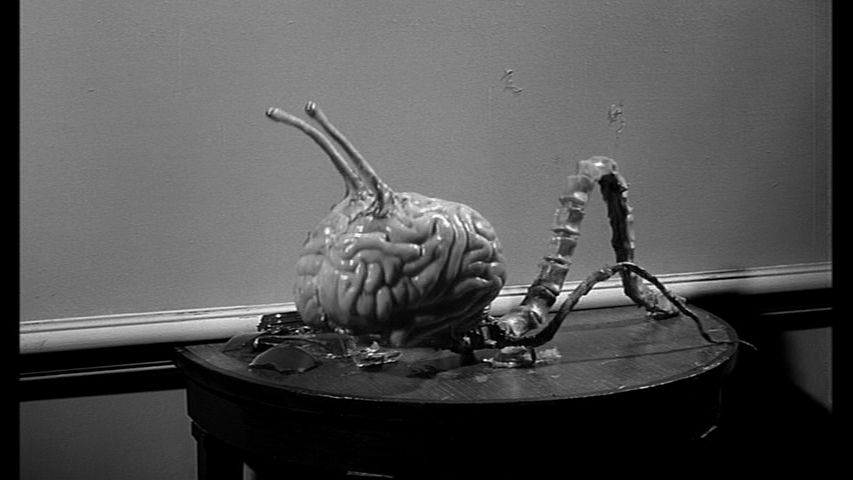 FIEND WITHOUT A FACE features aliens not from outer space but created through mental thought right here on Earth. A scientist who is experimenting with telekinesis and thought projection ends up creating a living fiend, that then steals the brain and spinal cord of local farmers. Though initially invisible, thanks to feeding on atomic energy from a nearby military base, the fiends soon take form and the airbase is overrun with brain creatures who are being replicated. The creatures have developed tendrils that, with the spinal cord, allow them to become quite mobile, even with the ability to jump. They have also developed two eyes on the ends of two stalks at the front of the brain. They are easily killed with guns but are finally destroyed when the source of their food, the radar installation’s power machinery, is blown up. Though the animation used to bring the fiends to life seem primitive by today’s standards, they are very creepy to look at. They are very realistic and how they move is quite clever.