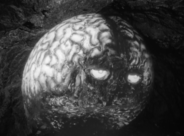 THE BRAIN FROM PLANET AROUS is about an alien brain creature terrorist called Gor who comes to Earth and possesses a scientist. Gor’s plan is to use his powers to take over the world, threatening to destroy any nation that goes against him. Meanwhile, a second brain creature named Vol, also arrives to bring Gor as his prisoner back to their home planet of Arous. The brains are kind of cool looking and float around like helium balloons. They have large eyes on the front and oftentimes the wires holding the props up can be clearly seen. This is one of those movies that grows on you in its campiness over repeated viewings.